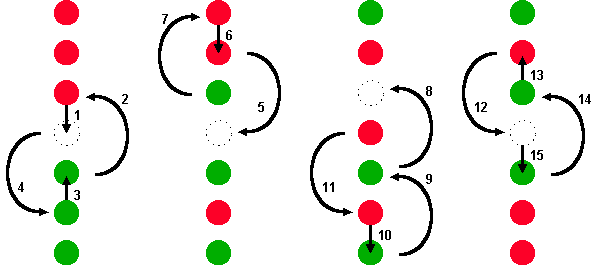 Die Gruppe der roten und grünen Leuchtpunkte sind nach dem Prinzip des Spiels Dame (ohne das Wegnehmen der übersprungenen Steine) auszutauschen. |